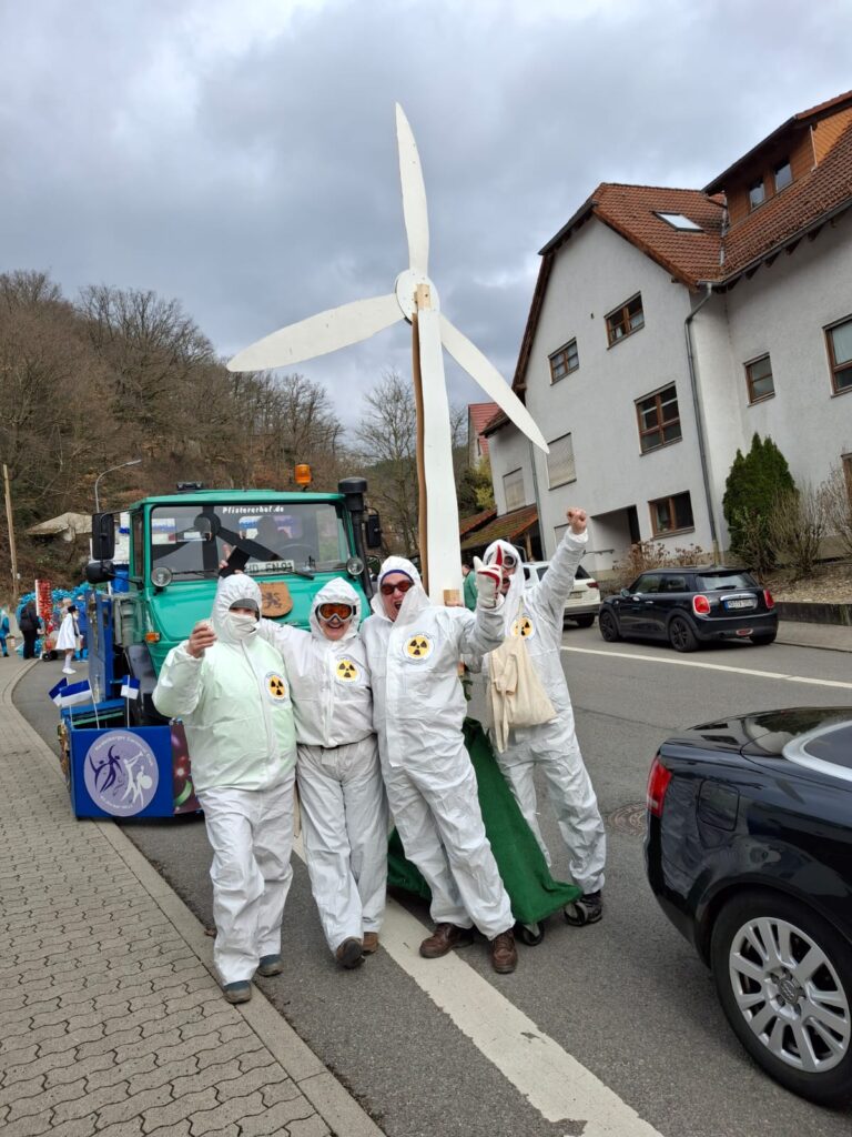 Ausgestattet mit einem 5 Meter hohen Windrad auf Rollen, einem gelben Ölfass, das sich hervorragend zum Trommeln eignete (sogar einige Zuschauer machten begeistert mit) und einem kleinen Mottowagen, kam die über 20 Mann starke Fußgruppe beim Publikum bestens an. Die weißen Schutzoveralls taten ihr Übriges.